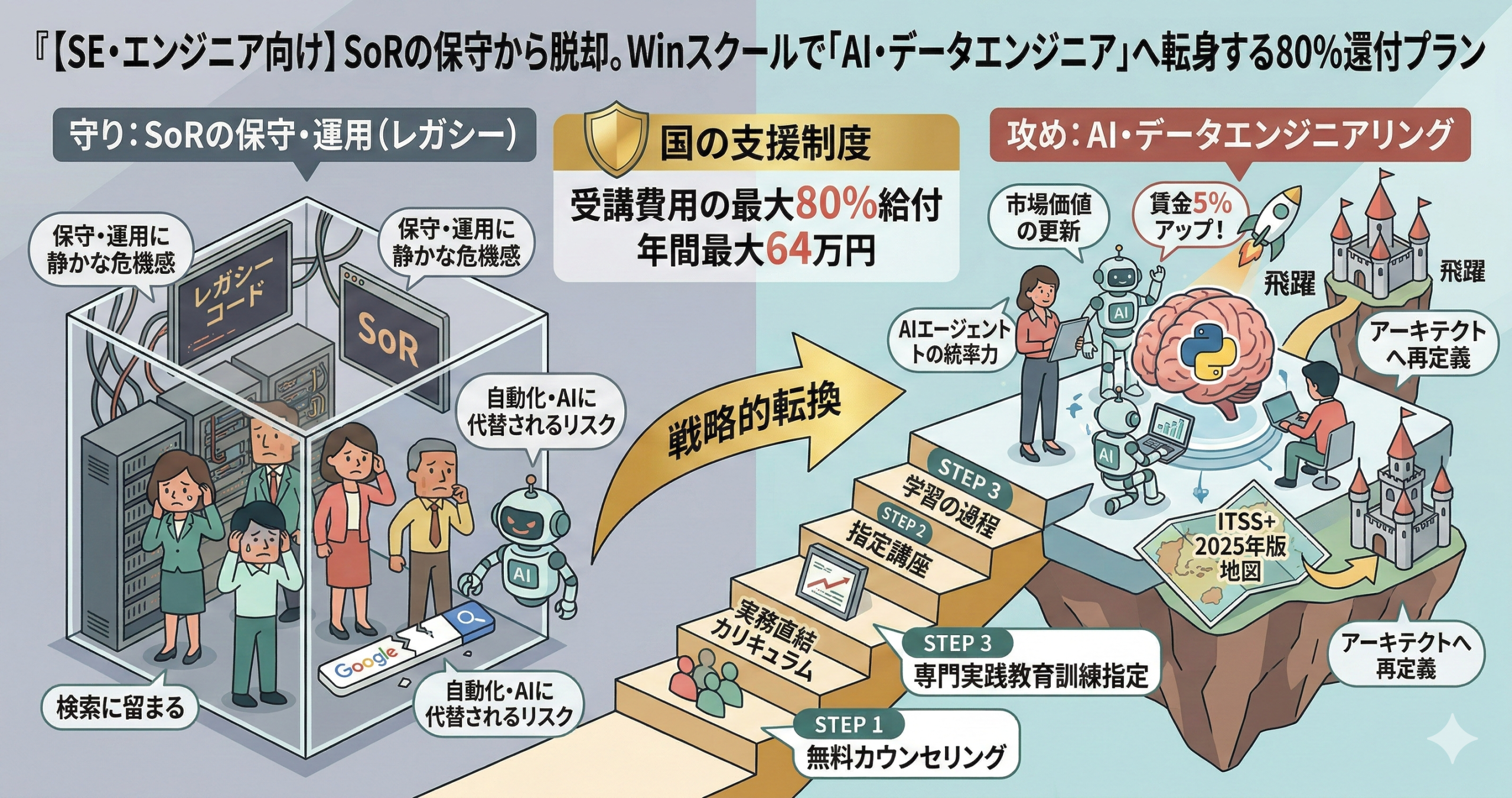 Winスクールの対象講座は、国が「将来性が高い」と認めた証拠だ。2024年10月の改正により、受講費の最大80%(実質負担は2割!)が戻ってくる最強のプランとなっている。 - 2026年度版・新講座の充実: